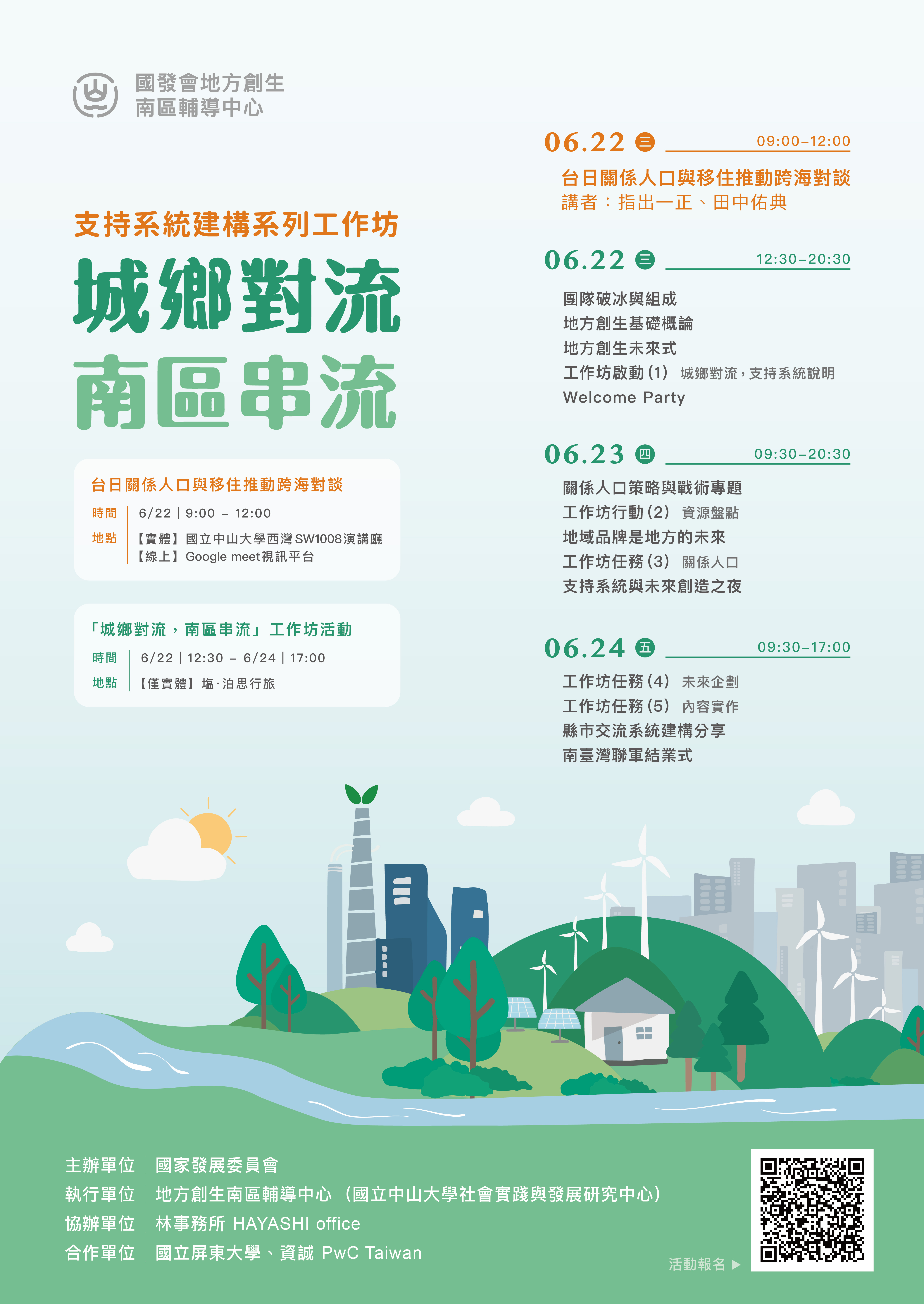 一、為了打造城鄉人口雙向對流,解決鄉村人口外移的現象,並建構南區地方創生支持系統,爰訂於111年6月22日上午採實體與線上方式辦理「台日關係人口與移住推動跨海對談」、111年6月22日下午至6月24日採實體方式舉辦「城鄉對流,南區串流」工作坊。